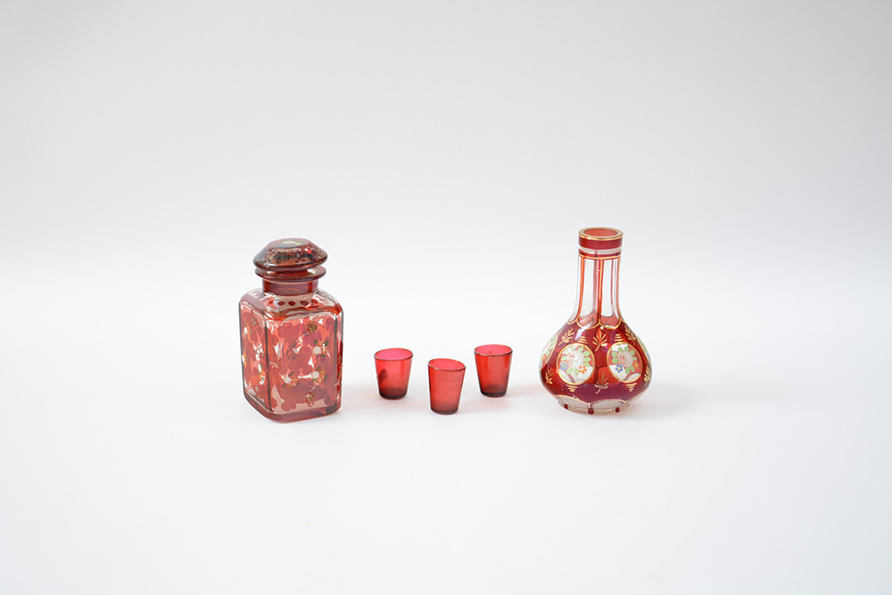 Manifattura di Boemia, lotto composto da un vasetto, un contenitore con coperchio e tre bicchierini da rosolio (lievi difetti)