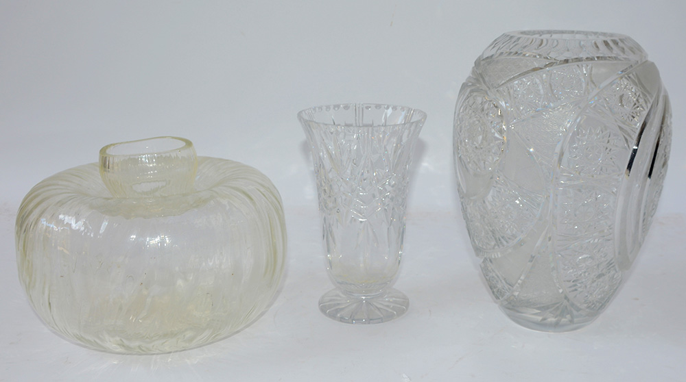 Lotto composto da due vasi in cristallo molato e uno in vetro a forma di zucca (h max cm 30) (difetti)