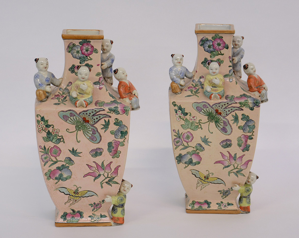 Coppia di vasi in porcellana policroma decorata con faciulli applicati e motivi floreali, marchio apocrifo sul fondo, Cina (h cm 32)(difetti)
