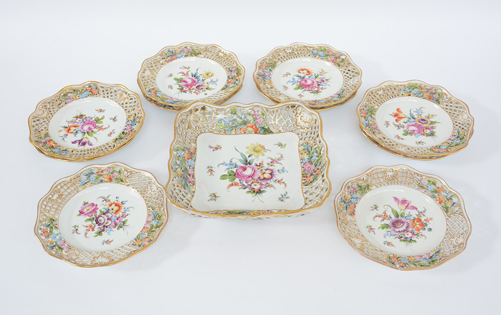 Manifattura di Dresda, servizio per frutta composto da un centrotavola quadrato e dieci piatti con tesa traforata, decorati in policromia con mazzi di fiori (lievi difetti)