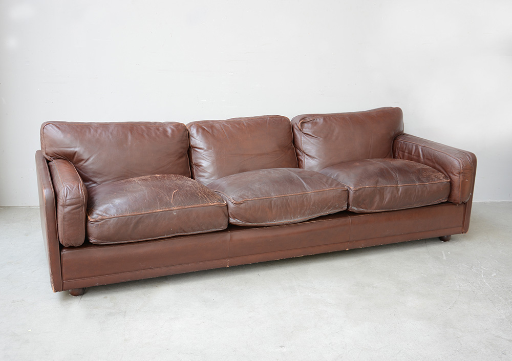 Divano imbottito a tre posti rivestito in pelle color tabacco. Produzione Poltrona Frau, anni 70. Accompagnato da fodera in tessuto bianco (cm 243x50x88) (difetti)