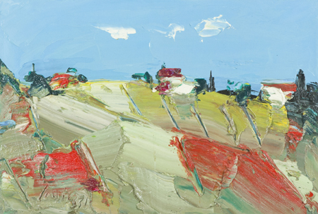Sergio Scatizzi Gragnano (Lu) 1918 - Firenze 2009 Case sulla collina, anni 2000 Olio su tavola, cm. 34x50 Firmato in basso a sinistra. Autentica con etichetta, firma e timbro a secco dell'Archivio "Studio d'Arte Moderna Il Fiore", Montecatini Terme.