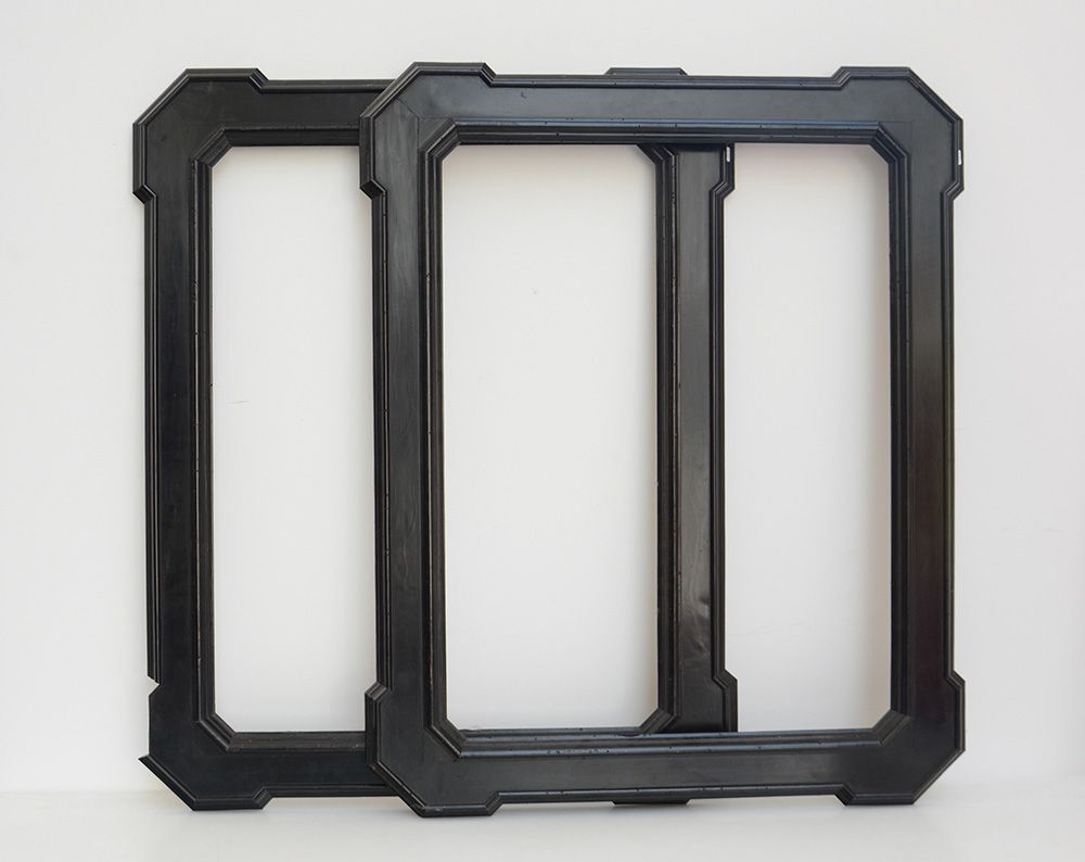 Coppia di cornici in legno ebanizzato con profilo sagomato e angoli smussati...