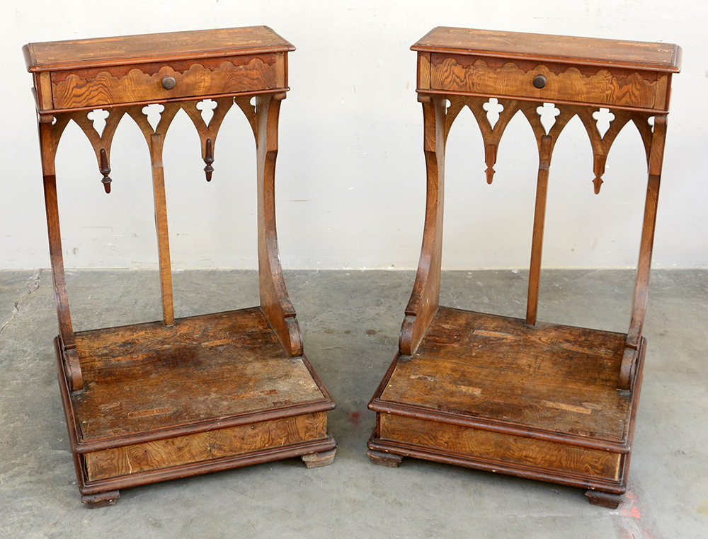 Coppia di inginocchiatoi neogotici laccati a finto legno, un cassetto...