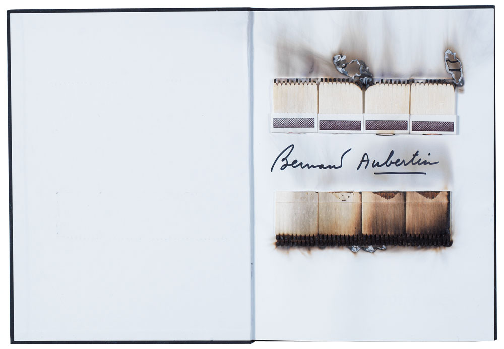 BERNARD AUBERTIN Fontenay aux Roses 1934 - Dessin de feu, 2010, applicazioni di fiammiferi e combustioni su libro "Bernard Aubertin, il fuoco e il rosso", edizioni Galleria Rosenberg cm. 31x45, firma sulla destra, dichiarazione d'autenticità dell'artista su foto, entro teca in plexiglass.