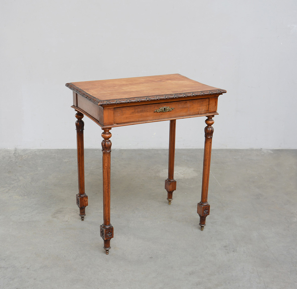 Tavolo scrittoio ad un cassetto con fascia intagliata a motivi concatenati, gambe tornite, scanalate (cm 70x8250)