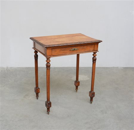 Tavolo scrittoio ad un cassetto con fascia intagliata a motivi concatenati,...