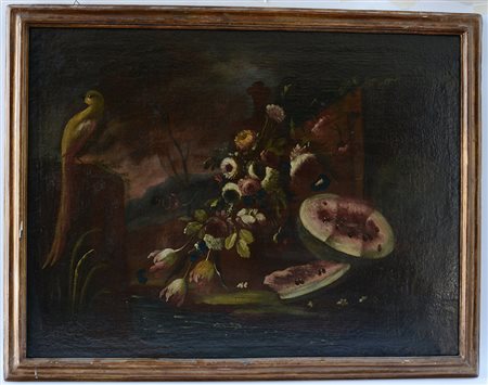 Scuola napoletana del secolo XVIII - "Natura morta en plein air", olio su tela (cm 73x99), in cornice (difetti)