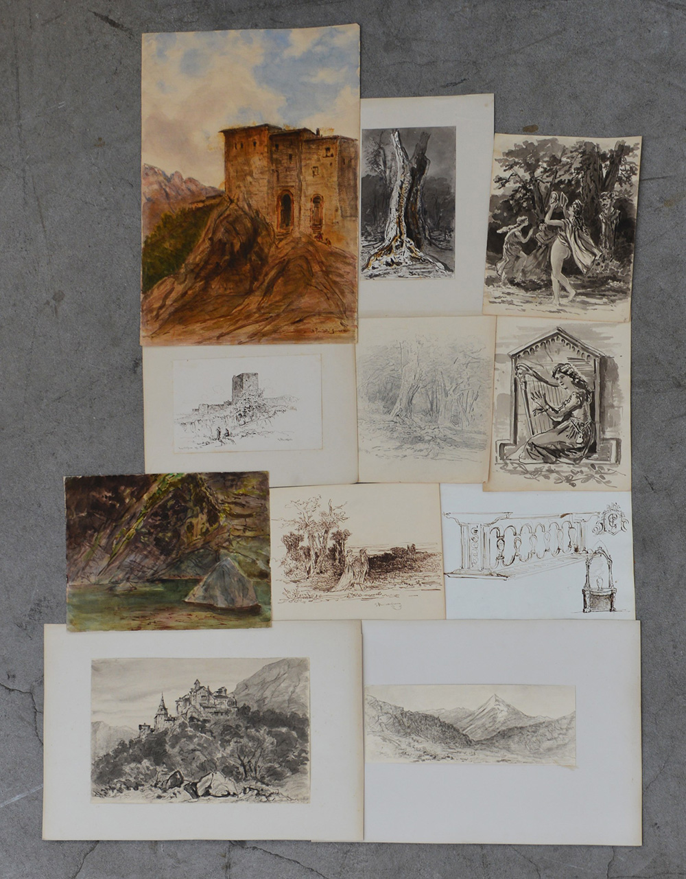 Giuseppe Puricelli Guerra (Gallarate 1832-Casirate D'Adda 1894)Cartelletta contenente undici tra disegni, bozzetti, incisioni ed acquarelli per lo più raffiguranti paesaggi, molti firmati (difetti)