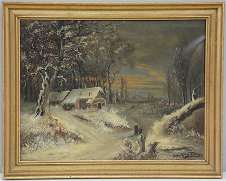 Jules Tasquin ( 1872- 1912)"Paesaggio invernale con figure" olio su tela (cm 40x53) firmato in basso a destra, in cornice (difetti)