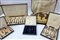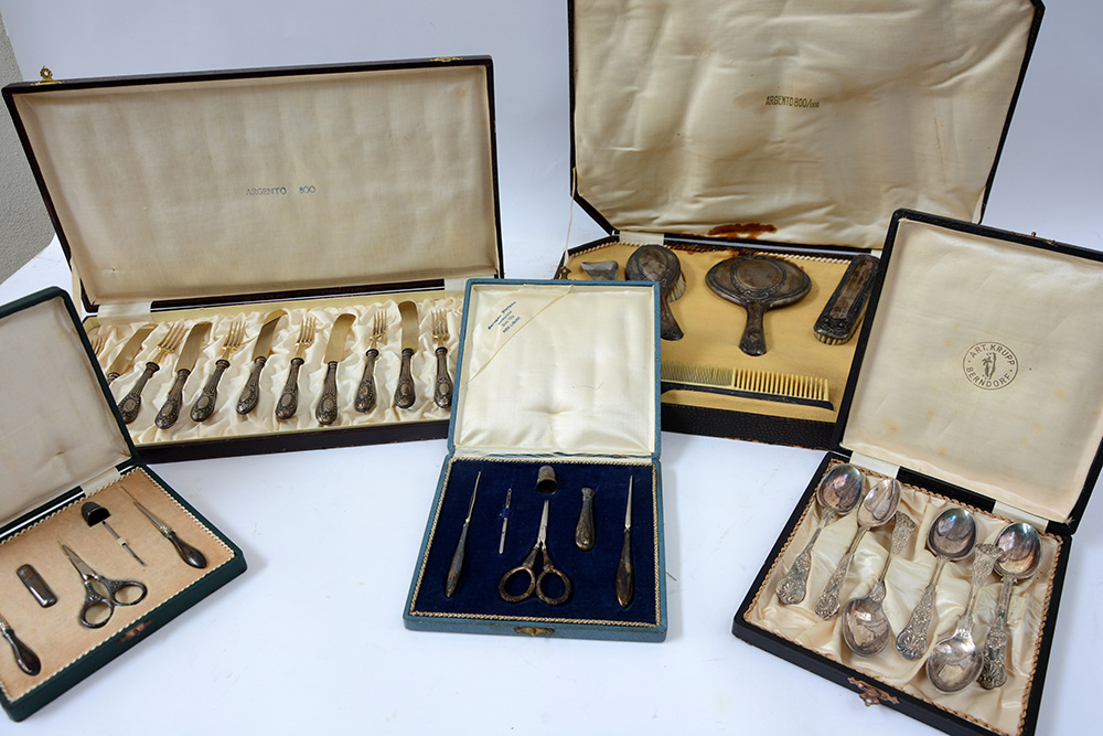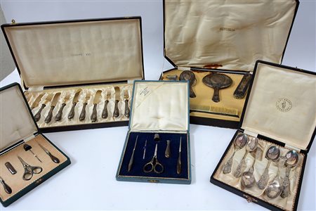 Lotto composto da sei cucchiaini in metallo argentato marcati Art Krupp; un servizio da toilette, due servizi da cucito in lamina d'argento e metallo; sei forchette e sei coltelli da dolce in argento e metallo dorato, in custodie (difetti)