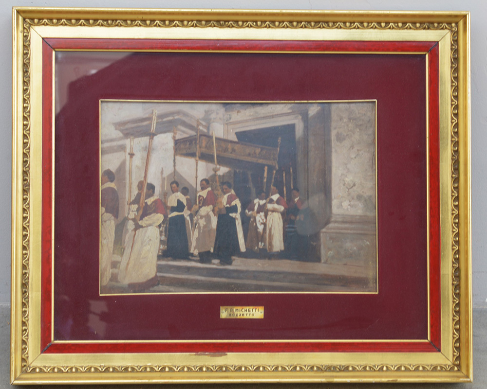 Ignoto, "La processione del Corpus Domini", olio su cartone incollato su tavola (cm 28x40), in cornice (difetti)