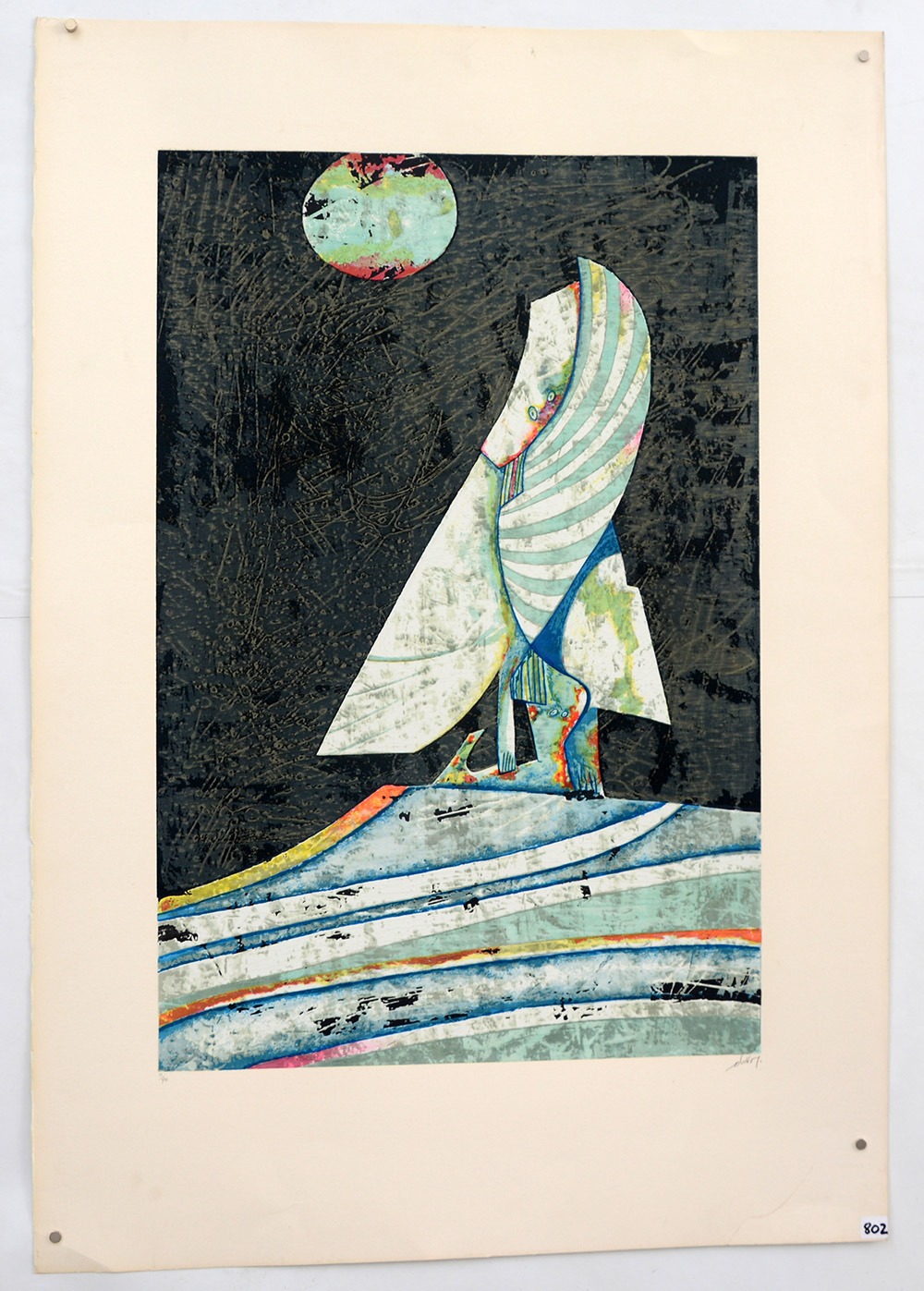 Gianni Dova (Roma 1925-Milano 1991)"Personaggio" 1974, serigrafia (foglio cm. 100X70), firmata e numerata 11/90 in basso in lapis. Etichetta al retro della Galleria Ars D, Milano (lievi difetti).