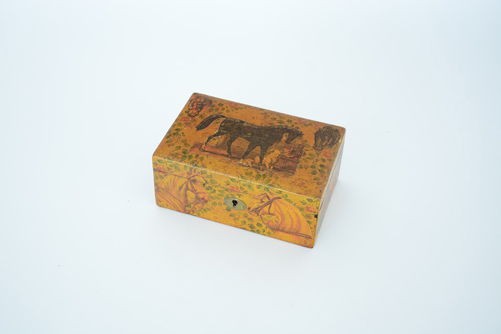 Scatola portagioie decorata in arte povera, cavalli e animali domestici. Inscritta all'interno "Boots Fency dept. British manufacture"