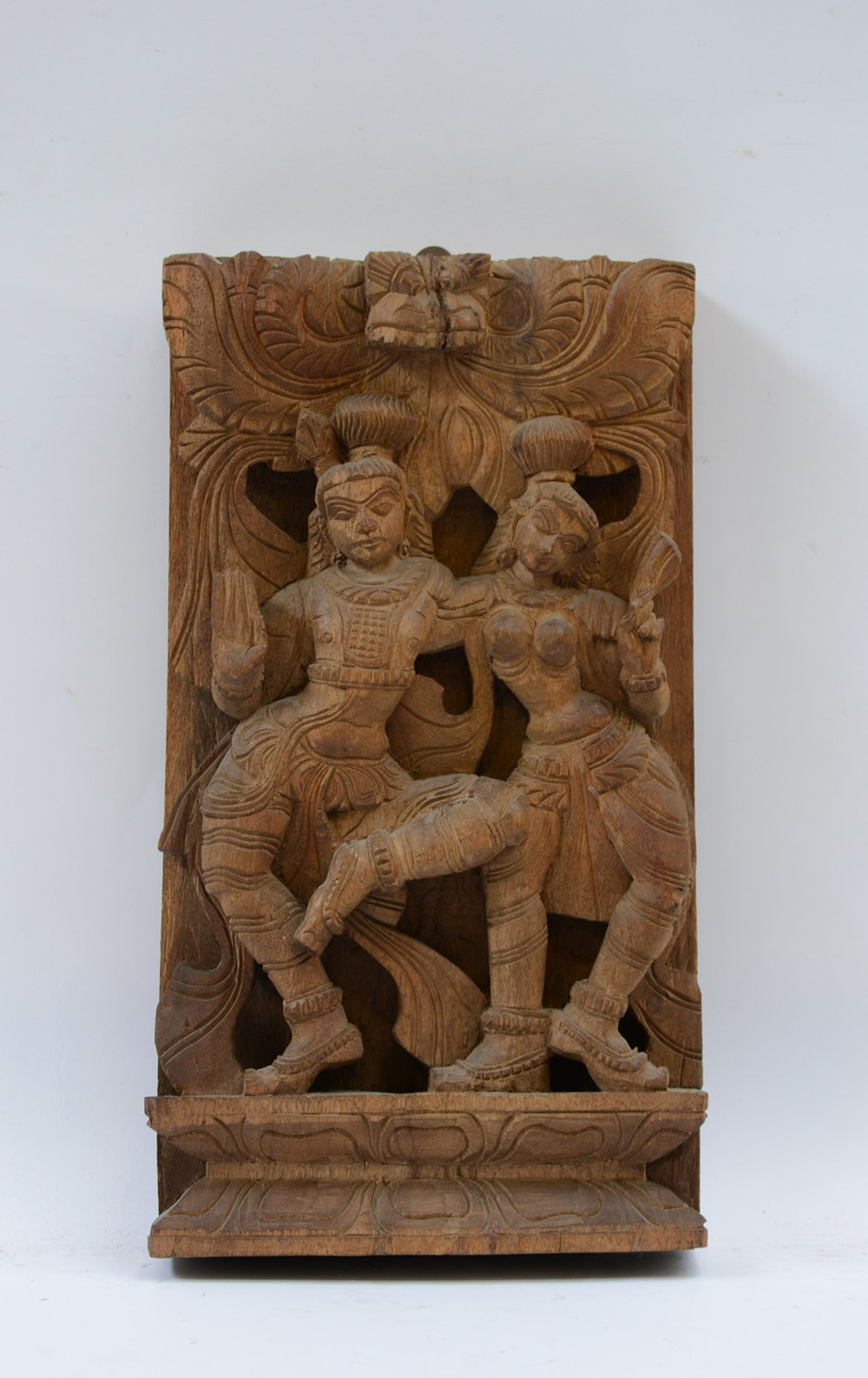 Manifattura Thailandese, pannello in legno intagliato con figure danzanti (lievi difetti)