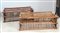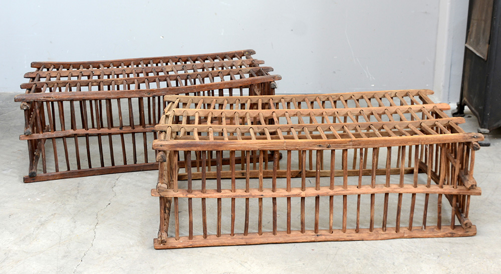 Coppia di tavolini etnici da salotto in legno con struttura a giorno a forma di gabbia (cm 106x35x61 circa) (difetti)