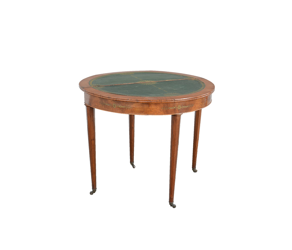 Tavolo da gioco a mezza luna con fascia intarsiata in ottone a motivi...