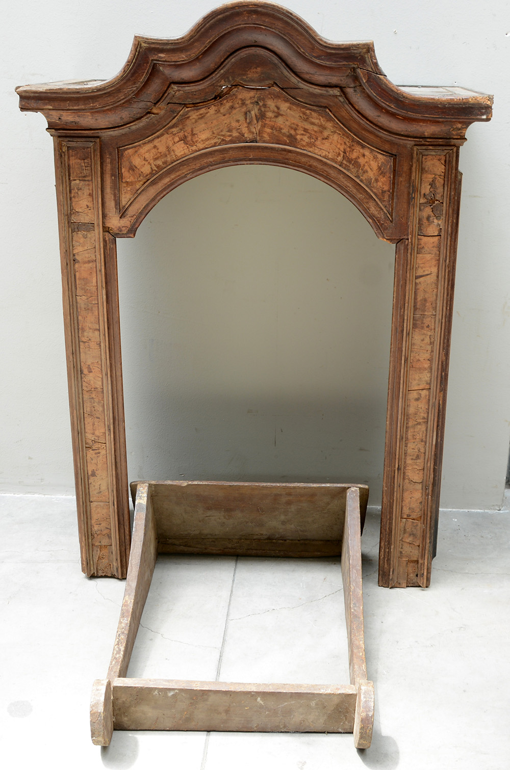 Lotto composto da un antico tabernacolo in legno con cimasa mossa (cm...