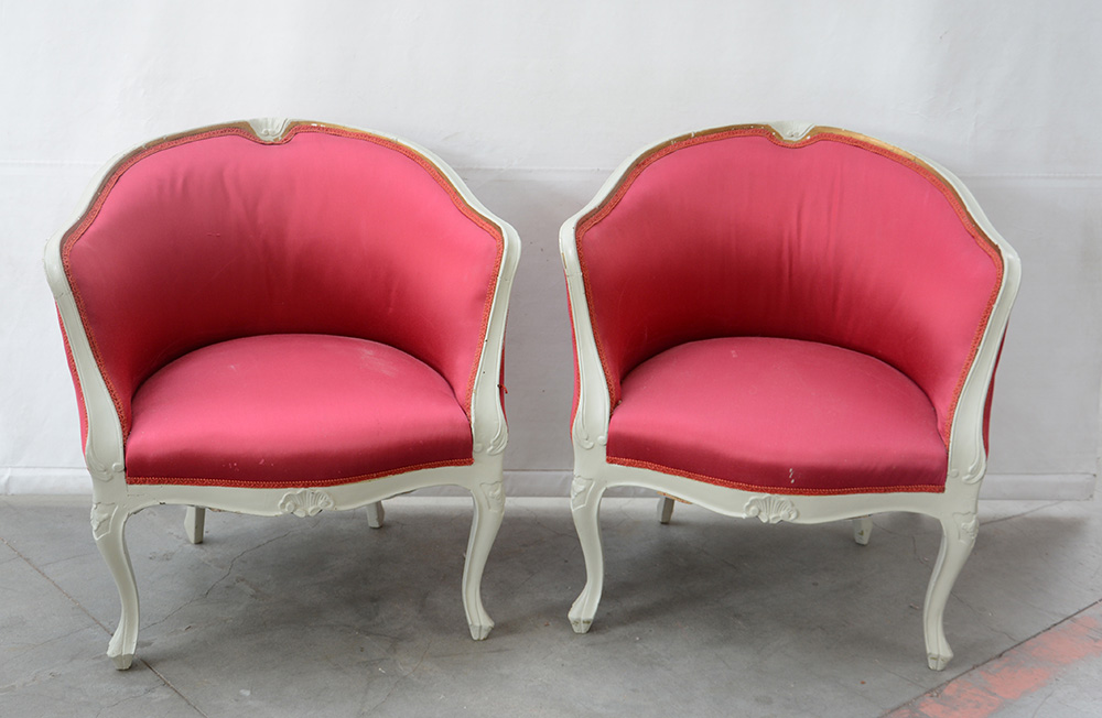 Coppia di poltroncine da camera a pozzetto con struttura in legno laccato grigio e rivestimento in tessuto bordeaux (difetti)