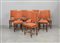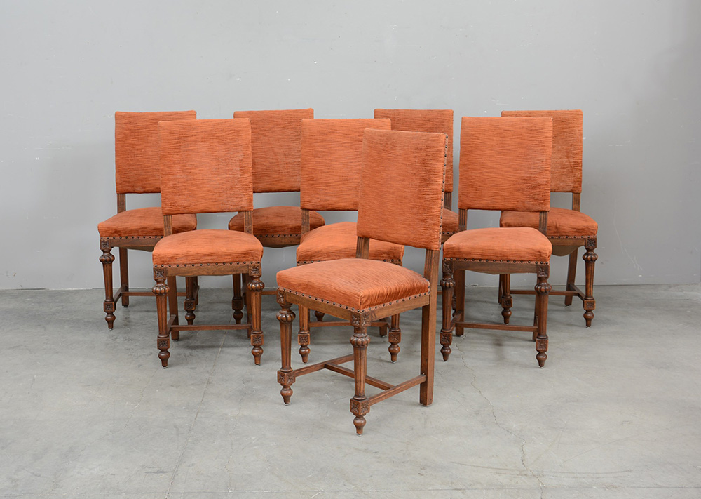 Gruppo di otto sedie in legno intagliato, seduta e spalliera ricoperte in...