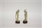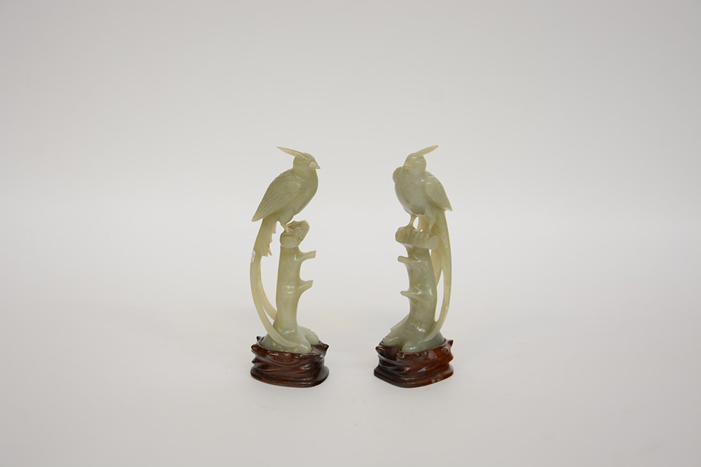 Coppia di sculture in giada color verde celadon raffiguranti uccelli del paradiso su ram, con basi in legno (difetti, restauri e mancanze) Cina, sec. XX (h. 17,5 cm.)