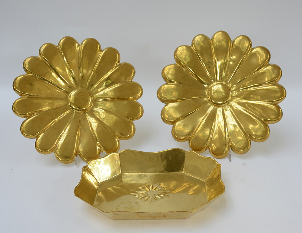 Lotto composto da tre centrotavola in ottone marcati Carlo Mozzoni. Milano (lievi difetti)