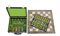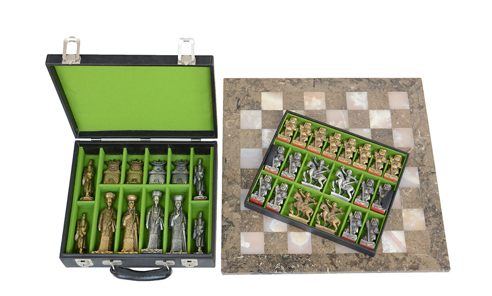 Scacchiera in pietra dura (cm 60x60) completa di pezzi in metallo argentato e dorato contenuti in custodia (difetti)