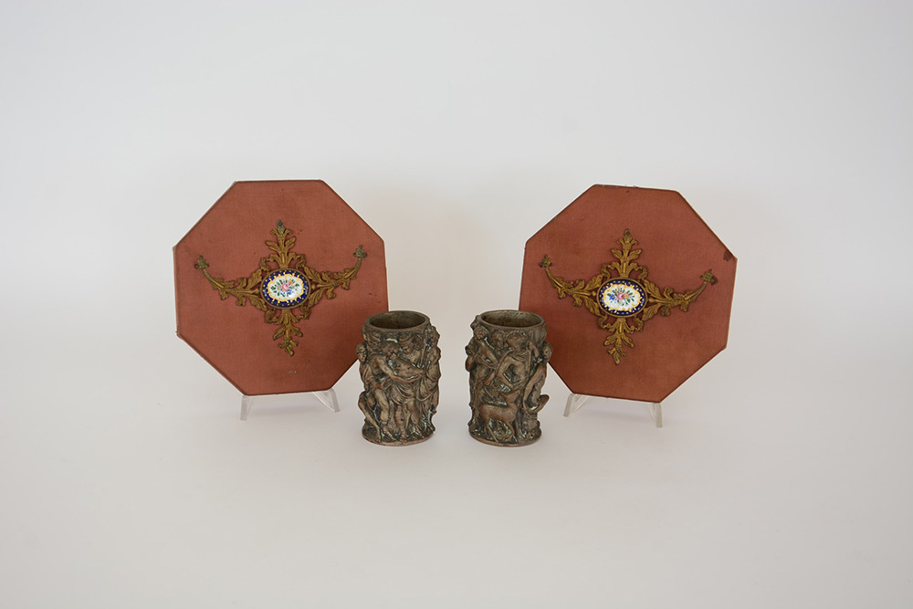 Lotto 877 | Lotto composto da due vasetti manifattura di Signa e due fregi in metallo...