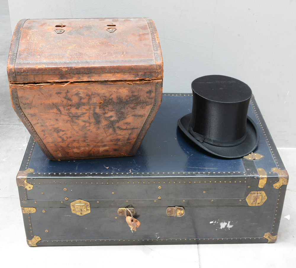 Lotto composto da un cappello a cilindro della Chapellerie Musnier di St. Etienne, completo di cappelliera rivestita in cuoio, e un bauletto da viaggio con scomparti e vano porta grucce (difetti)