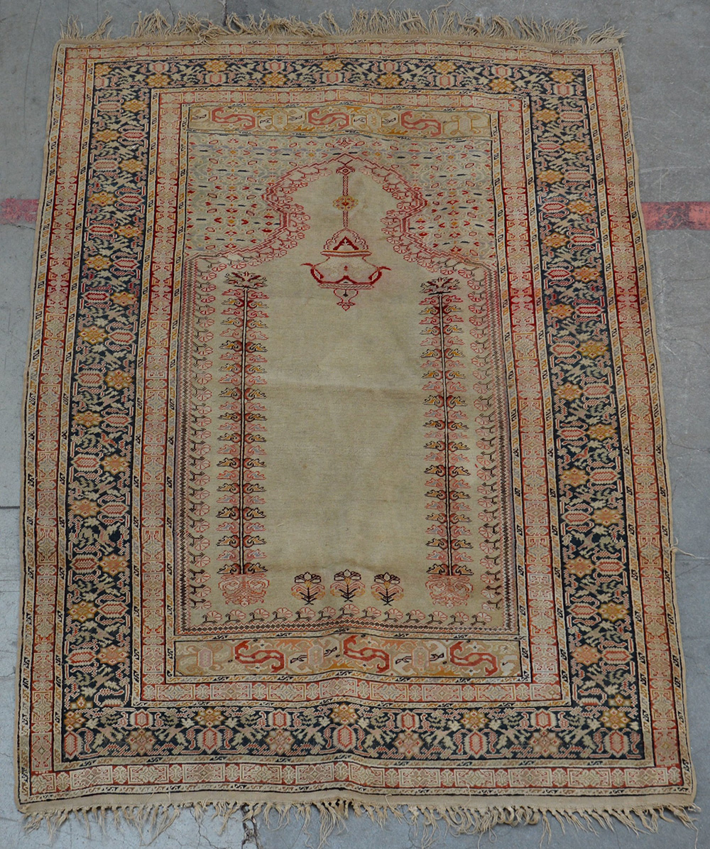 Tappeto preghiera Panderma, Anatolia inizio sec. XX. Mirab a fondo beige decorato con lampada votiva e due alberi della vita (cm 180x132) (difetti)
