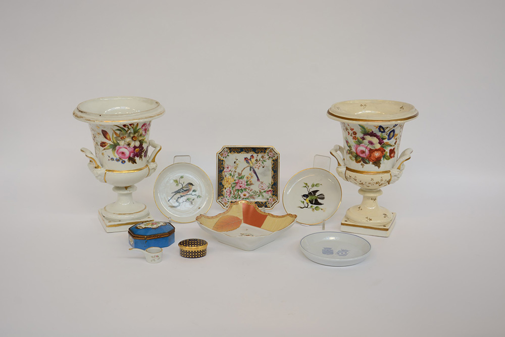 Lotto composto da due vasi biansati in porcellana francese della fine del secolo XIX (uno con gravi difetti e restauri) due piattini Rosenthal, un alzatina Limoges e due posaceneri, due scatoline con coperchio, un piccolo mestolo di manifatture e decori diversi