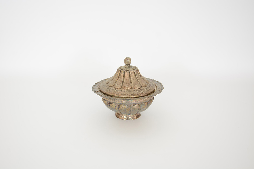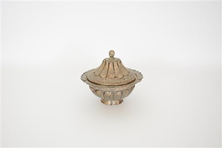 Ciotola con coperchio in rame argentato. Sec. XIX (difetti)