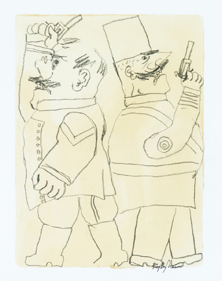 Franz Borghese Roma 1941 - Roma 2005 Alla pistola!, 2005 Carboncino e gouache, cm. 25x18, su carta di cm. 50x35 Firmato in basso a destra. Bibliografia: "Borghese antologia di Opere dipinti, disegni e gouache degli anni Settanta - Duemilacinque", edizione "Il Gianicolo Centro d'Arte", Perugia, pag. 313, Tav. 47.