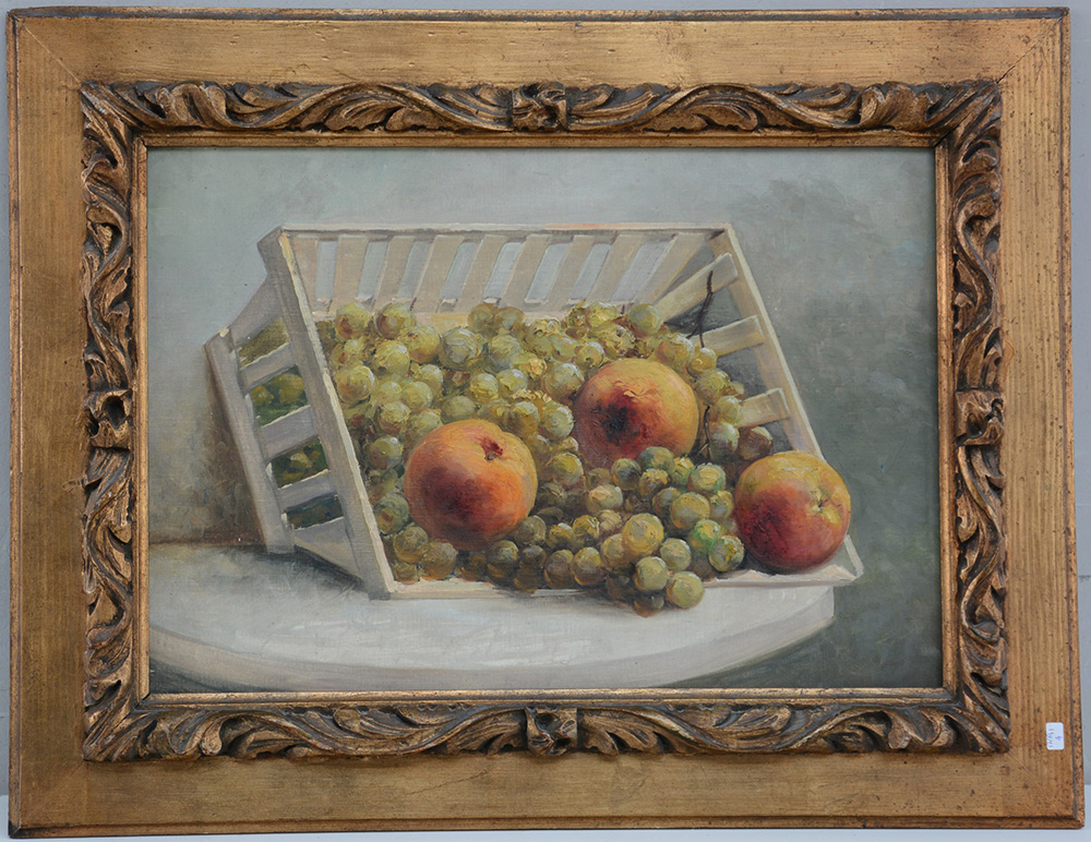 Ignoto "Cesto di frutta" olio su cartone telato (cm 36x51) in cornice (lievi difetti)