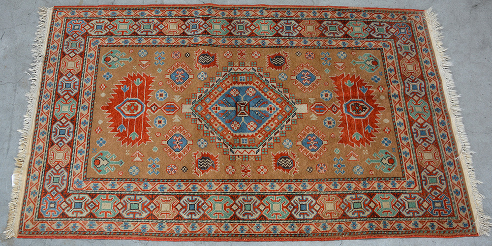 Tappeto Shirvan moderno, Caucaso sec. XX. Disegno Kuba con medaglione azzurro su campo cammello (cm 132x82)(difetti)