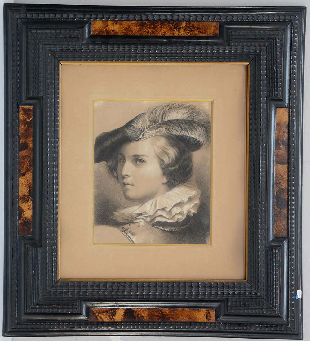 Ignoto "Ragazzo con cappello piumato" disegno a matita e biacca (cm 30x25) in cornice a decoro guillochet