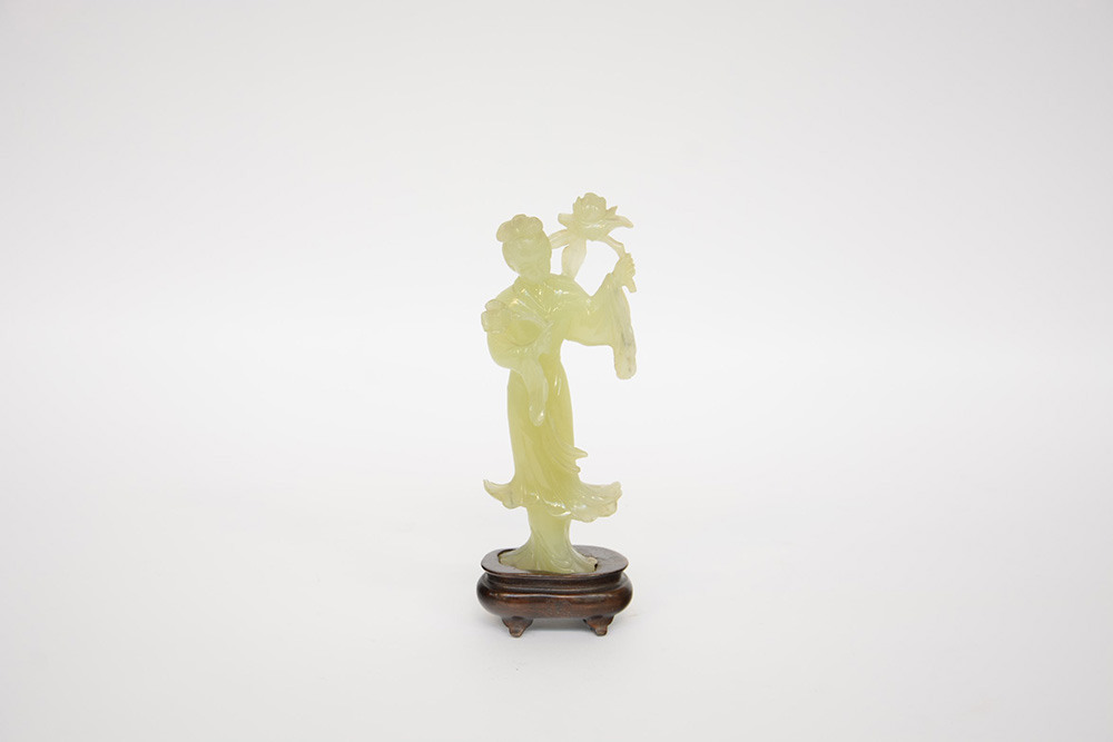 Scultura in giada color celadon, raffigurante dama dalle lunghe vesti con fiori, con base in legno(difettti) Cina, sec. XX (h. 19 cm.)