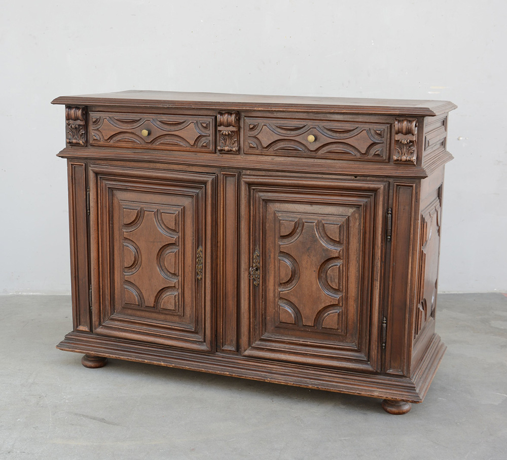 Credenza in stile piemontese a due cassetti grandi e tre piccoli sottopiano e...