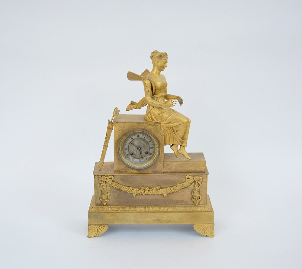 ANONIMO, FRANCIA Pendola in bronzo dorato sormontata da figura allegorica alata Epoca metà sec. XIX Movimento a carica settimanale, suoneria ore mezze, scappamento ad ancora, sospensione a filo Quadrante argentato a numeri romani (h. cm 44) (probabile sostituzione del movimento)