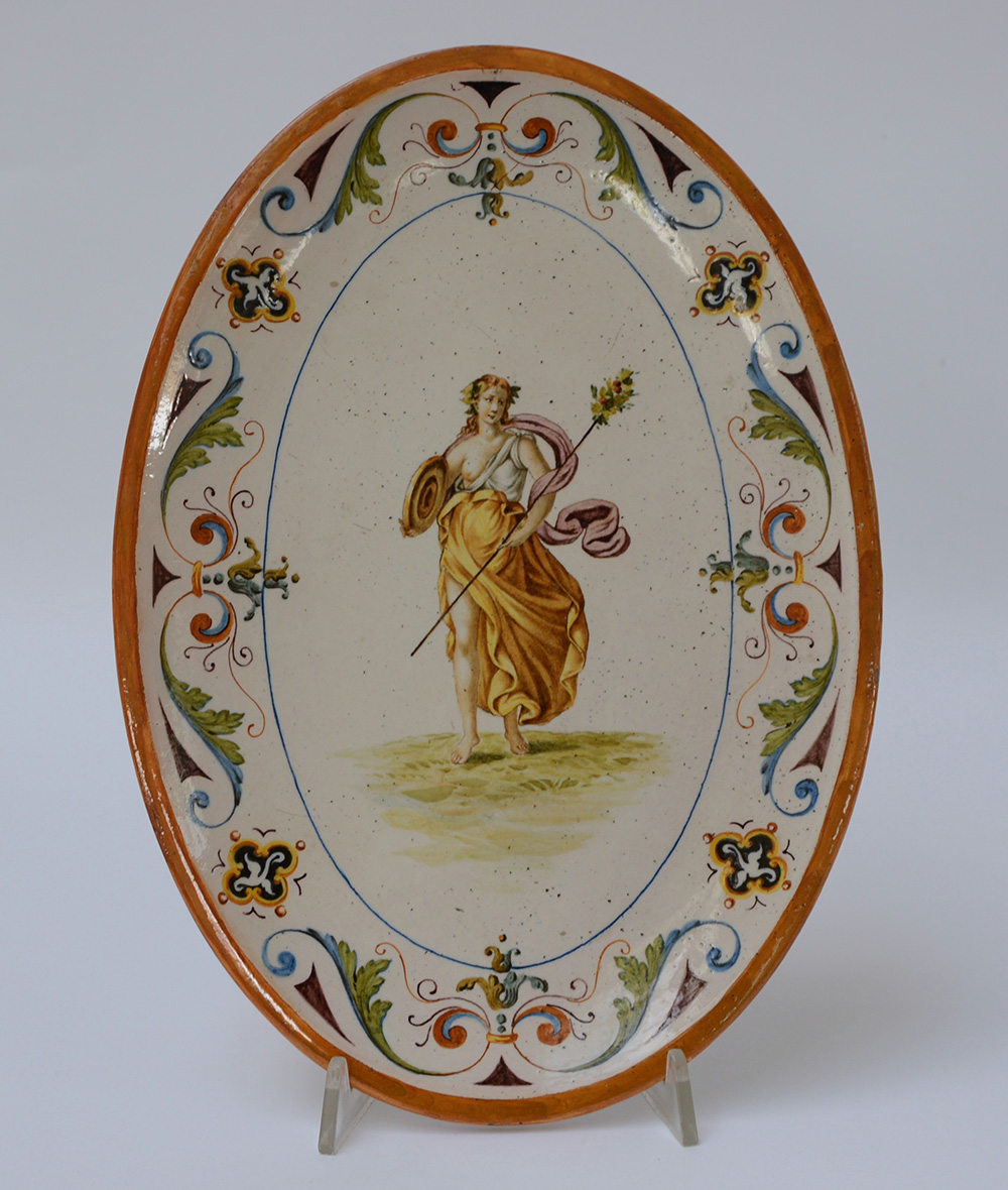 Manifattura Ginori, piatto in ceramica di forma ovale, decorata nel cavetto a figura allegorica (cm 23x33)