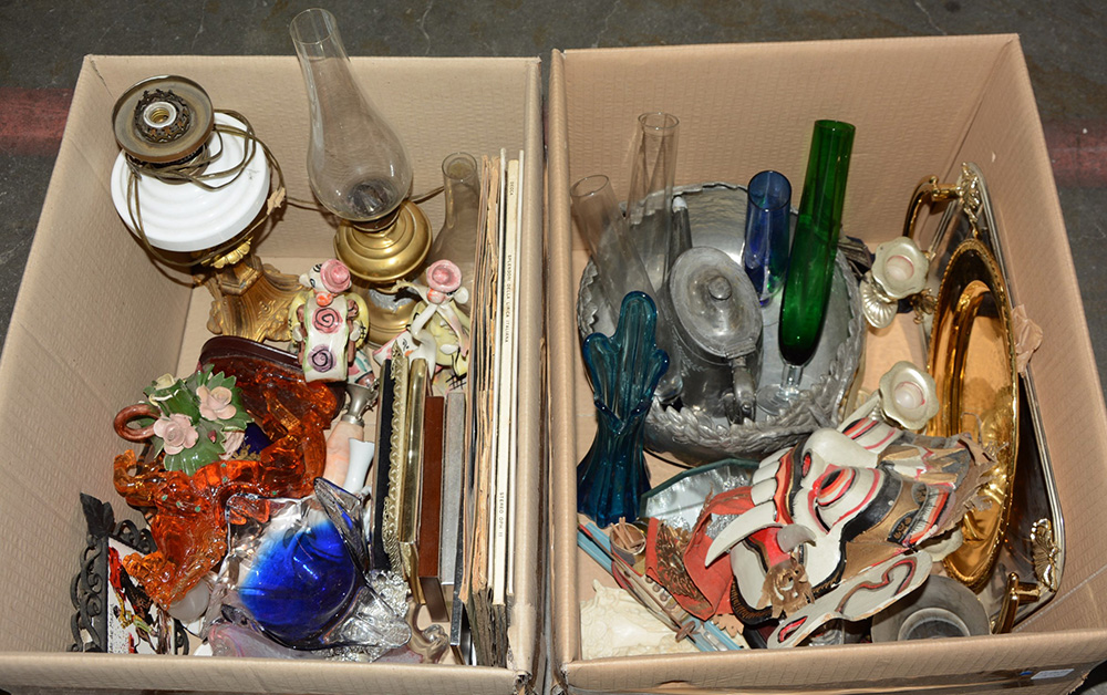 Lotto di due cartoni contenenti numerosi souvenir e oggetti di uso e...