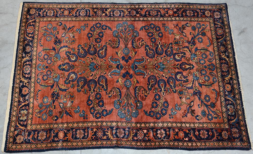 Tappeto Lilian, Persia fine sec. XIX. Disegno a mazzi di fiori nei toni del blu, azzurro e beige su fondo rosa antico. Bordura Herati su fondo blu (cm 200x159)(difetti)