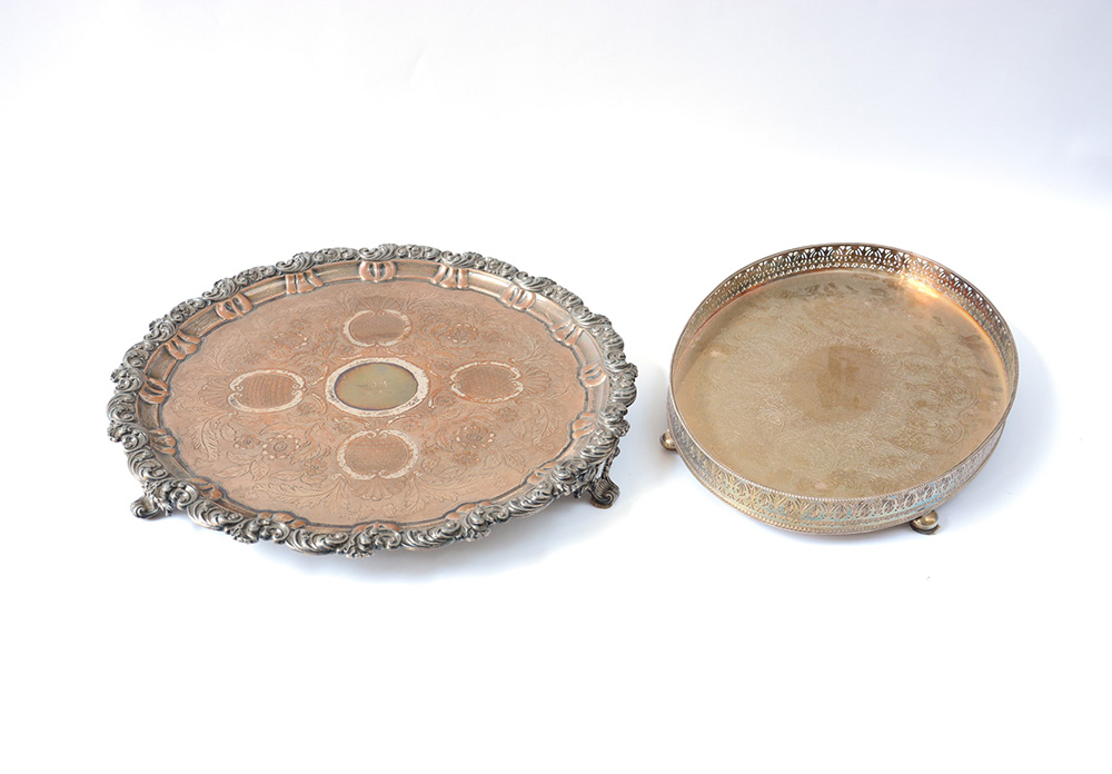 Lotto composto da due vassoi in metallo argentato: un salver con decoro a rocaille e un vassoio ovale con ringhiera traforata (l max cm 49) (difetti)