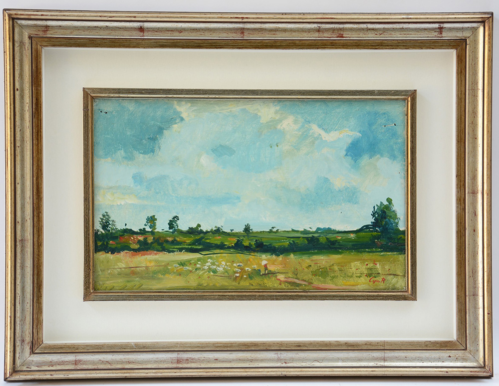 Firma indecifrata, "Paesaggio", olio su compensato (cm 30x48,5) firmato in basso a destra, in cornice