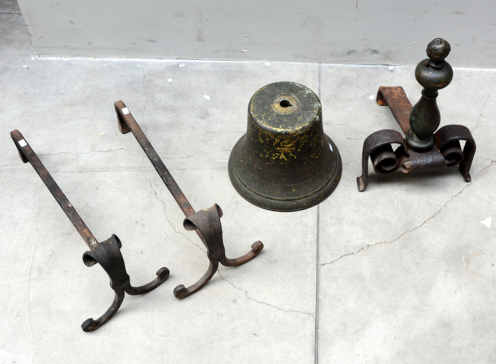Lotto composto da un alare del sec. XVII in ferro battuto e bronzo culminante con un pomolo a quattro volti, una campana in bronzo del sec. XIX e due alari in ferro battuto (difetti e mancanze)