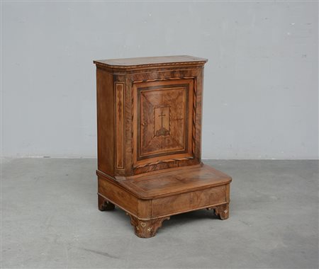 Antico inginocchiatoio lastronato in noce e filettato in legno chiaro ad...