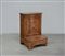 Antico inginocchiatoio lastronato in noce e filettato in legno chiaro ad un'anta intarsiata. Base ad un cassetto. Gambe mosse decorate in gesso (cm 64x90x51)