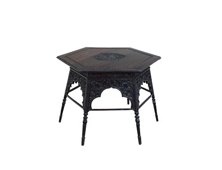 Tavolino da centro esagonale in stile moresco con piano lastronato in mogano ed intagli fitomorfi che si ripetono su tutta la superficie delle gambe (cm 89x70x101) (difetti)