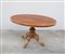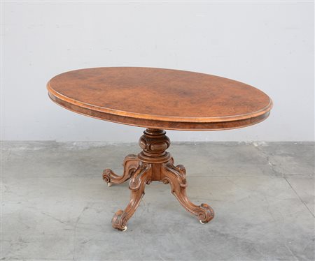 Tavolo ovale con piano lastronato in radica, gamba centrale tornita, terminante a quattro piedi sagomati e intagliati. Inghilterra, fine sec. XIX (cm 140x76x102)