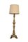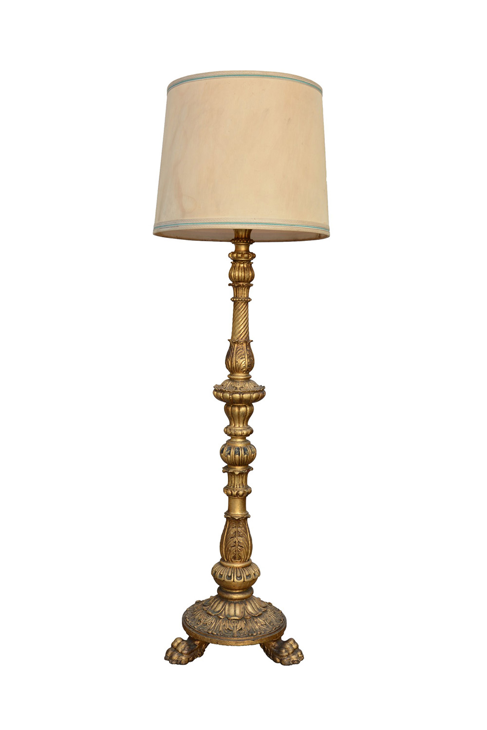 Piantana in legno dorato e intagliato a foglie d'acanto e bugnature. Base terminante a tre piedi ferini (h. cm 150) (difetti)